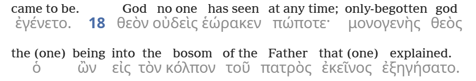 Greek is an inflected language, which is why the most literal translation reads weirdly in interlinears. “God no one has seen at any time” rather than “No one has seen God at any time”. But here, you can see that the word Theos is used to refer both to Jehovah (the first instance, which JWs will concede) and to The Logos, who the Interlinear team decided to render as a lowercase g “god” in the second instance. But why? Because of the lack of a definite article? Well, God The Father doesn’t have a definite article prior to him being called “God”. By their logic, shouldn’t that make Jehovah a “god”, not “God”? But they don’t want to say that.